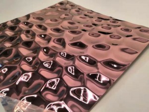 The surface of the ordinary metal corrugated sheet is flat, and the refracted image is also uniform and uniform. But if the metal plate is beaten with a hammer, the surface will become uneven, and the refracted picture can present a visual three-dimensional effect. Through different percussion methods, the metal water ripple sheet can be divided into three categories: large water ripples, small water ripples, and water scale patterns. Water ripple surface treatment methods include bright, brushed, gold, rose gold, black titanium, champagne gold, and sapphire blue.